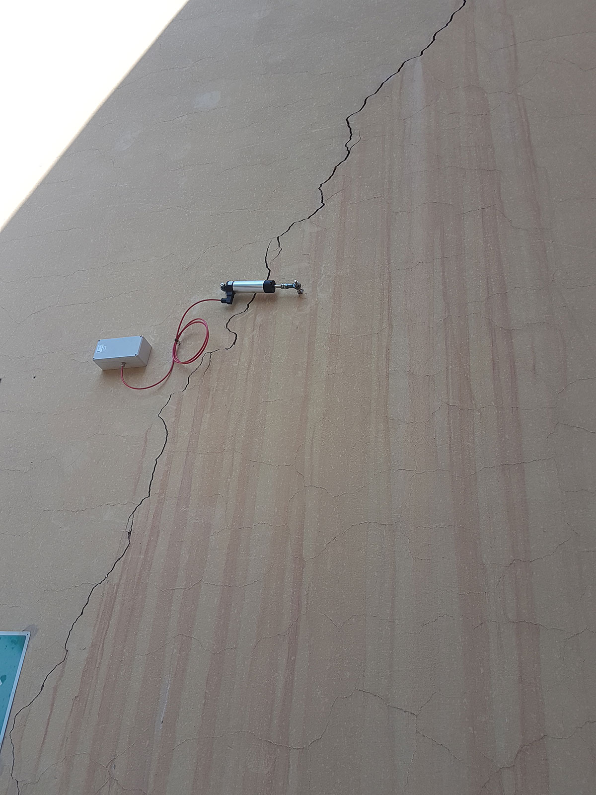 Per il controllo delle principali lesioni, durante l’attuazione degli interventi di consolidamento e restauro previsti, sono, attualmente, utilizzati 5 fessurimetri elettrici monodirezionali. Tali sensori sono generalmente utilizzati per il controllo di fessure superficiali in edifici, opere civili o opere storiche, aperture nel terreno, monitoraggio dei giunti strutturali in dighe, ponti o manufatti. Questo modello di fessurimetro unisce ottima robustezza, elevata risoluzione e sensibilità.